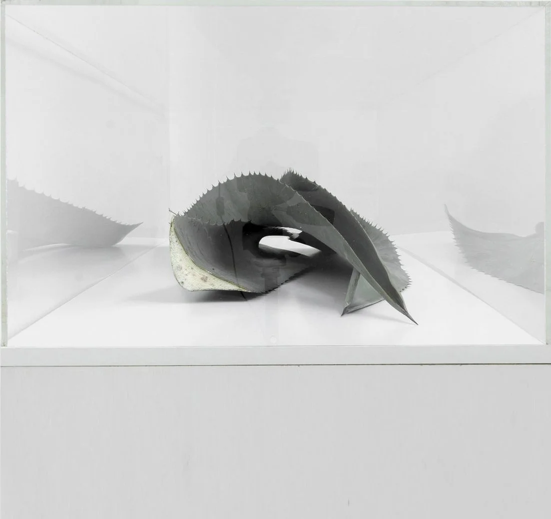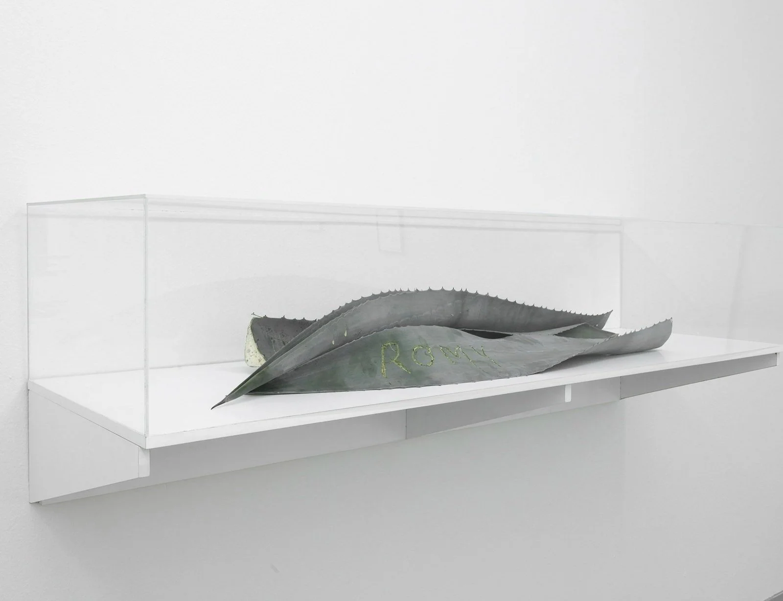 Two preserved agave leaves with penknife text inscription, mounted in wooden and acrylic display case | Two preserved agave leaves with penknife text inscription, glycerine, water and stabilisers. mounted in a wooden and acrylic display case.